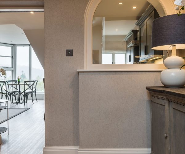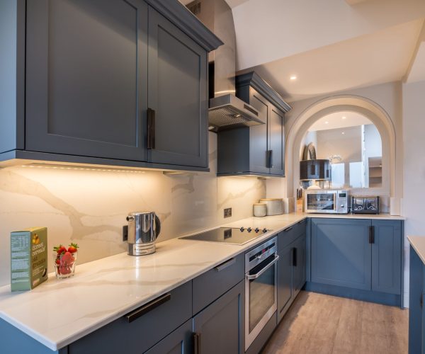 Entering into the spacious hall, you’re immediately drawn in by the arch of glass, showcasing the lake views on offer from the sink. You’ll soon find yourself entranced in the feature bay window, taking in the natural light and all the beauty that this apartment has to offer. The bespoke kitchen provides everything you need for self-catering in The Lake District, while the comfortable lounge offers peace and tranquillity after a day of exploring. Pale greys and muted tones set a truly relaxing note throughout the apartment, while the complementary lighting, bold patterns and carefully considered layout are a nod to the professionally designed interiors.